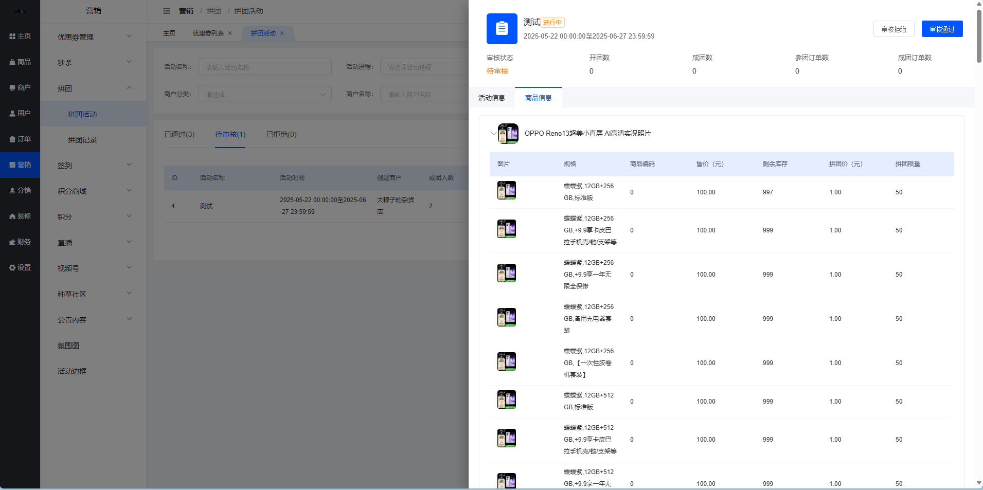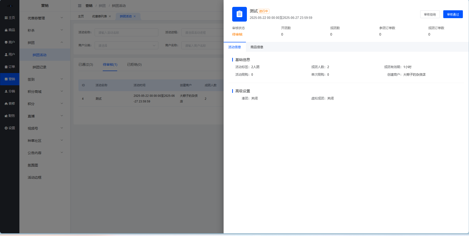 - 定期检查待审核活动,及时处理商家提交的拼团申请