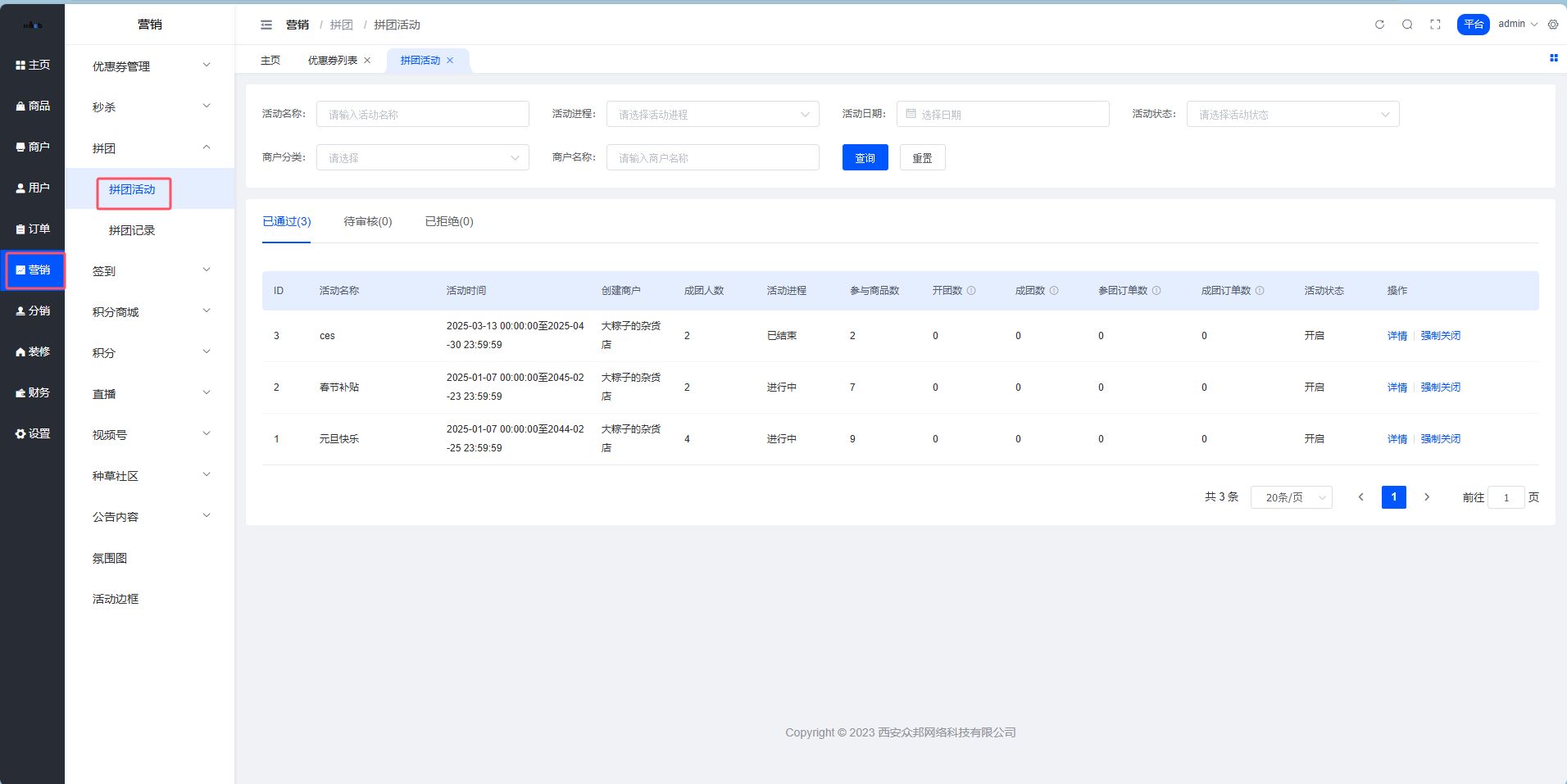 平台端拼团活动列表展示全平台店铺创建的拼团活动,拼团活动经平台审核通过拼团商品才能够在用户端展示,支持平台对已经审核通过的拼团活动进行强制关闭处置。