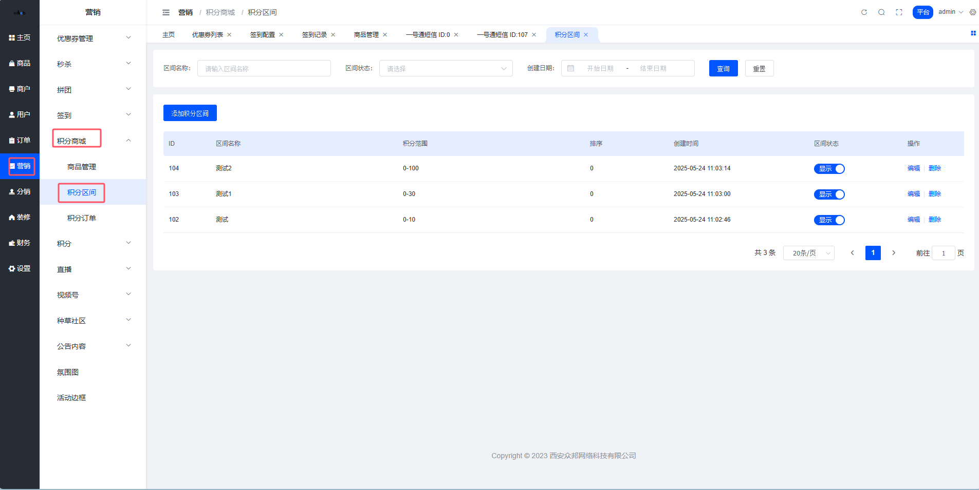 路径: 平台端 > 营销 > 积分商城 > 积分区间